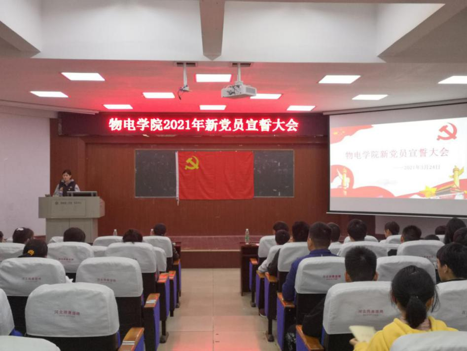 会议在国际歌的旋律中正式开始。首先,严胡伟向大会宣布了新党员名单。接着,在研究生党支部书记朱虹燕的带领下,全体新党员庄重地进行了宣誓,声音铿锵有力,表达了其强烈的入党意愿以及坚定的愿为共产主义奋斗终生的决心。
