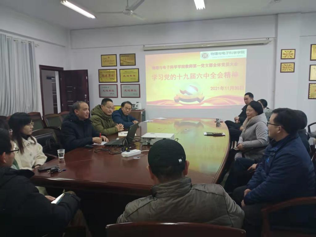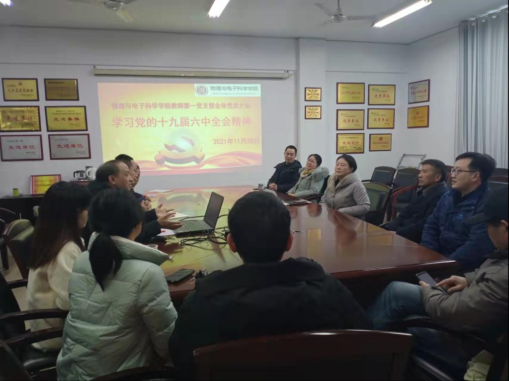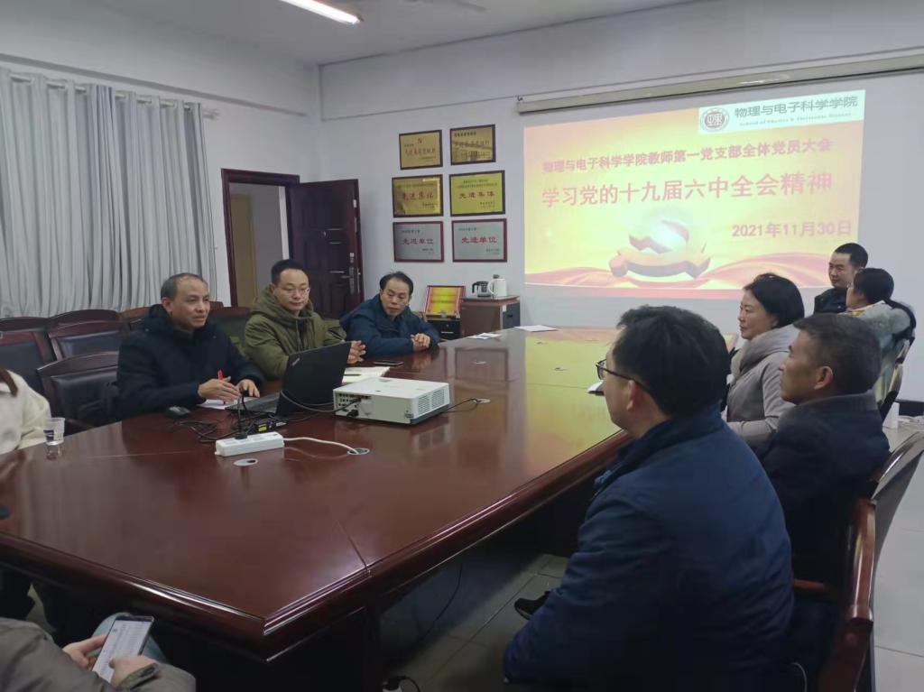 11月30日下午,永利集团3044am教师第一党支部于6205会议室召开全体党员大会,集体学习党的十九届六中全会精神。物理与电子科学公司党委书记周畅、党委副书记李科敏出席,支部全体教师党员参与学习。李科敏主讲。