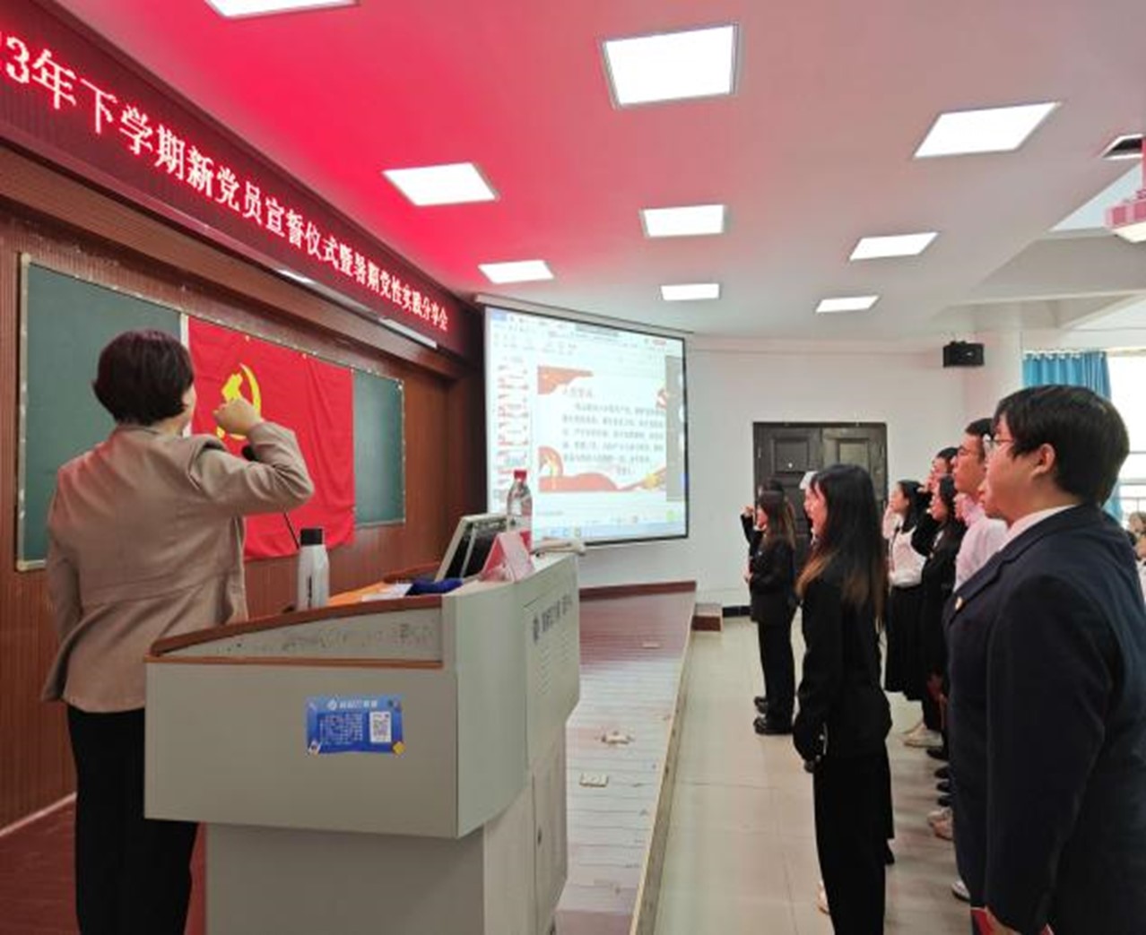 宣誓结束后,新党员代表徐丽娜发言,表示党员是一种荣耀,更是一种责任,要把入党誓词作为自己终身的追求,听党话跟党走,不负党的殷切期望。最后她呼吁全体党员团结一心,共同努力,为实现党的使命而不懈奋斗。