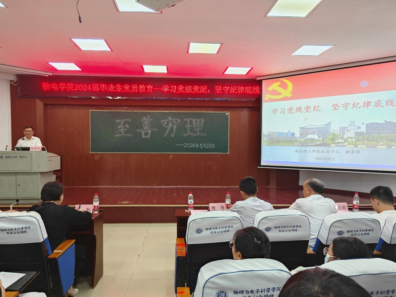 为深入学习贯彻习近平总书记关于党纪学习教育的重要讲话精神,扎实开展党纪学习教育,5月28日下午,物理与电子科学公司党委邀请公司党委委员、纪委书记谢贵辉为公司师生讲授“学习党规党纪,坚守纪律底线”的专题党课。公司党委委员、师生党员、入党积极分子100余人参加,公司党委书记周畅主持。