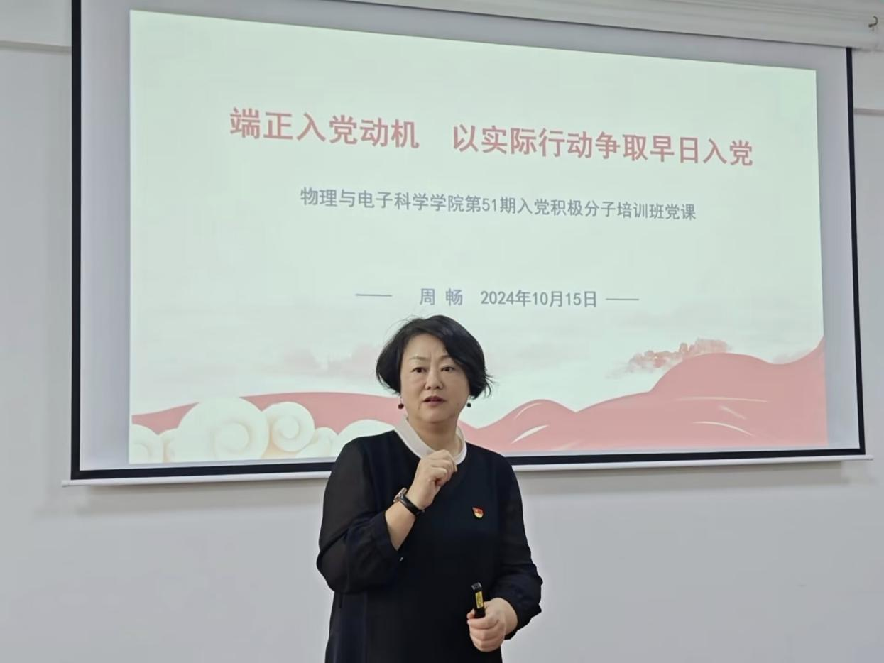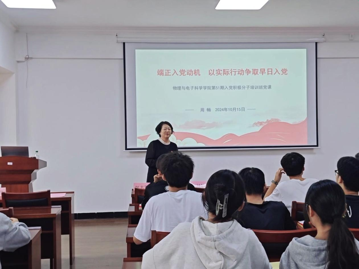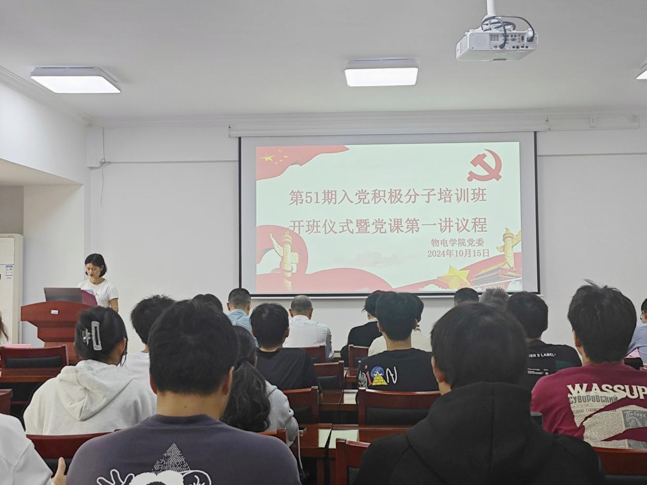 2024年10月15日下午,物理与电子科学公司党委在6211会议室举行第51期入党积极分子培训班开班仪式暨党课第一讲。公司党委委员、支部书记、第51期入党积极分子参加,何小娅主持。
