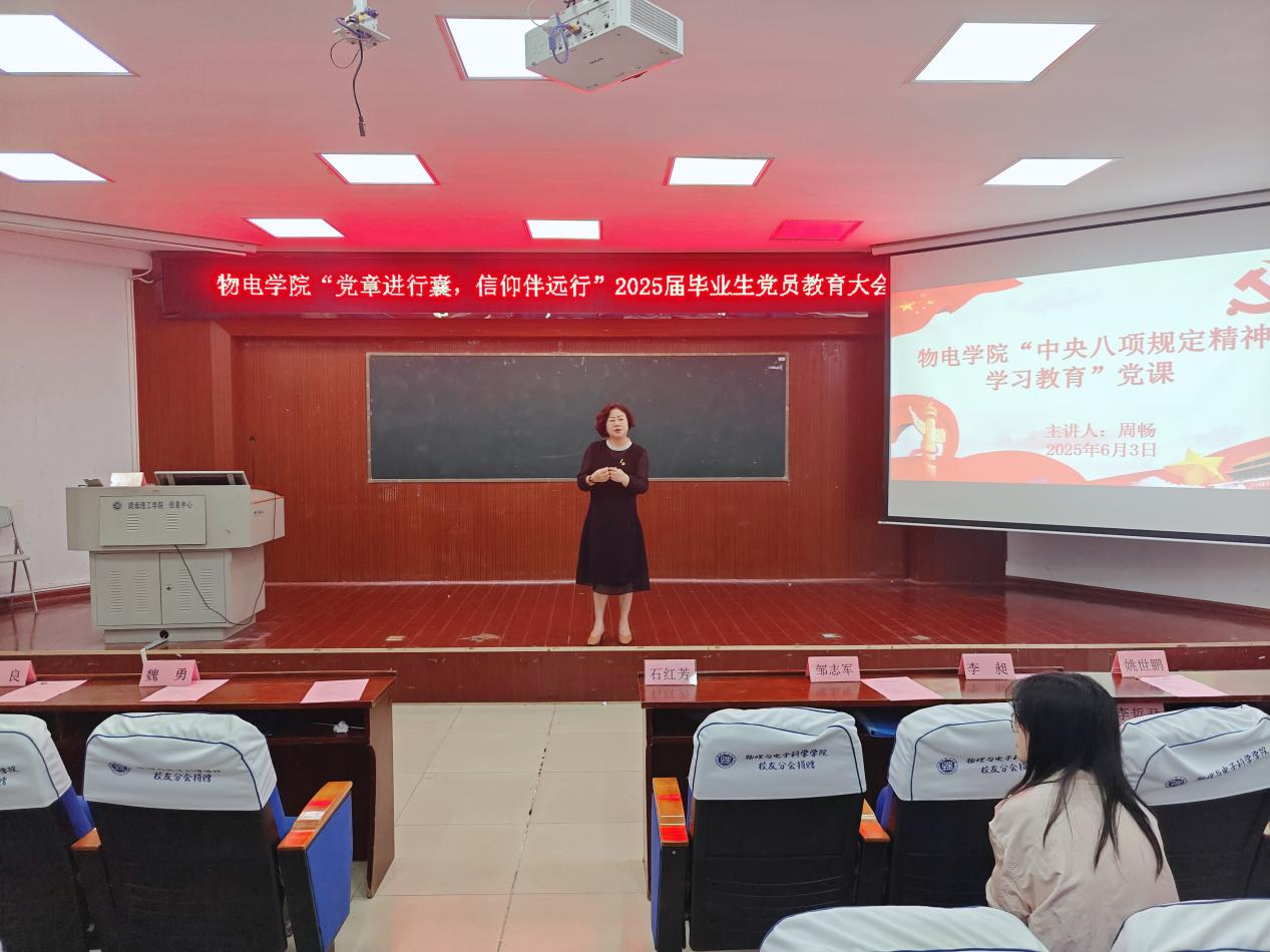 6月3日下午,物理与电子科学公司党委书记周畅为全体员工党员、入党积极分子、学理论示范寝室和示范班级成员,讲授了以“中央八项规定精神学习教育”为主题的专题党课。