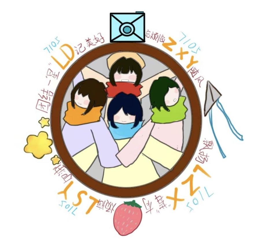7105的标识满是“青春活力与团结力量”!四位卡通形象环绕相拥,直观传递“团结一‘星’”的核心氛围;圆形框架形似生活相框,搭配“记美好”字样,寓意定格每段温馨日常;纸飞机藏着自由快乐,星星象征汇聚的光亮,草莓则以“‘莓’有烦恼”的谐音巧思,让寝室时光浸着轻松愉悦的暖意。
