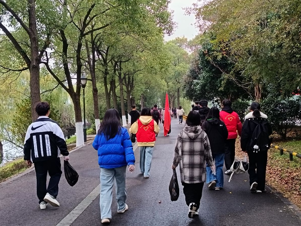 志愿者们从公司集合出发,沿着南湖绿道捡拾纸屑、塑料瓶,红马甲与红旗帜相辉映,成了秋雾里最鲜活的色彩,他们的足迹亦是青春在奉献和服务中成长的痕迹。