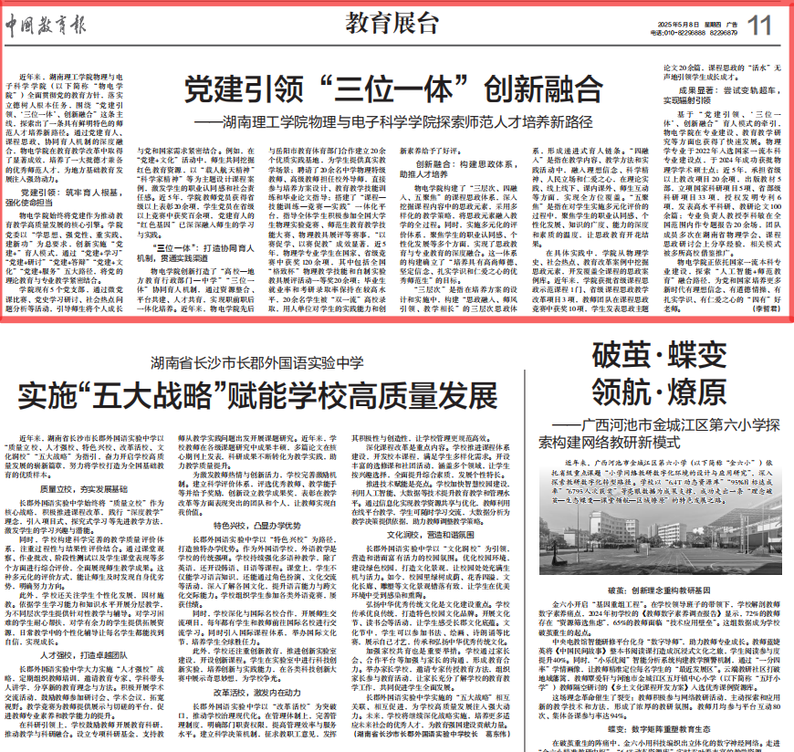 基于“党建引领、‘三位一体’、创新融合”育人模式的牵引,公司在专业建设、公司产品研究等方面也获得了快速发展。物理学专业于2022年入选国家一流本科专业建设点,于2024年成功获批物理学学术硕士点;近5年,承担省级以上教改项目20余项,出版教材5部,立项国家科研项目5项、省部级科研项目33项,授权发明专利6项,发表高水平科研、教研论文100余篇;专业负责人教授李科敏在全国范围内作专题报告20余场,团队成员多次在湖南省物理学会、课程思政研讨会上分享经验,相关模式被多所高校借鉴推广。