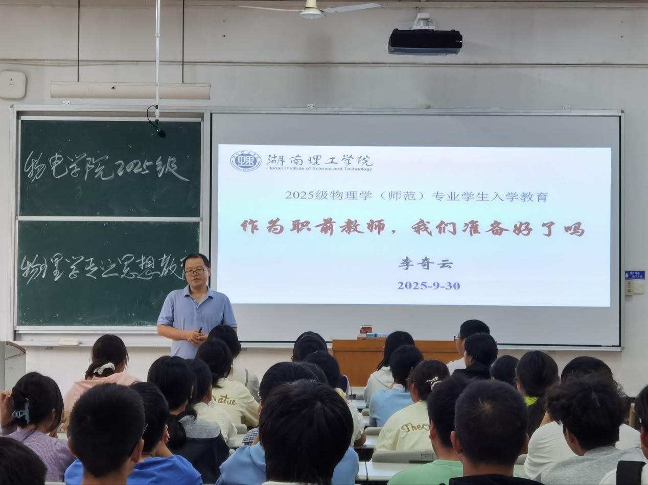 物理学(师范)专业由教研室主任李奇云主讲,他介绍专业培养模式、目标及课程体系,帮助新生深化认知。围绕“学高为师,身正为范”强调师范生素养,解读专业特色教育平台、团队及毕业生质量,并为新生适应老员工活、完成角色转变、规划生涯提供具体建议。