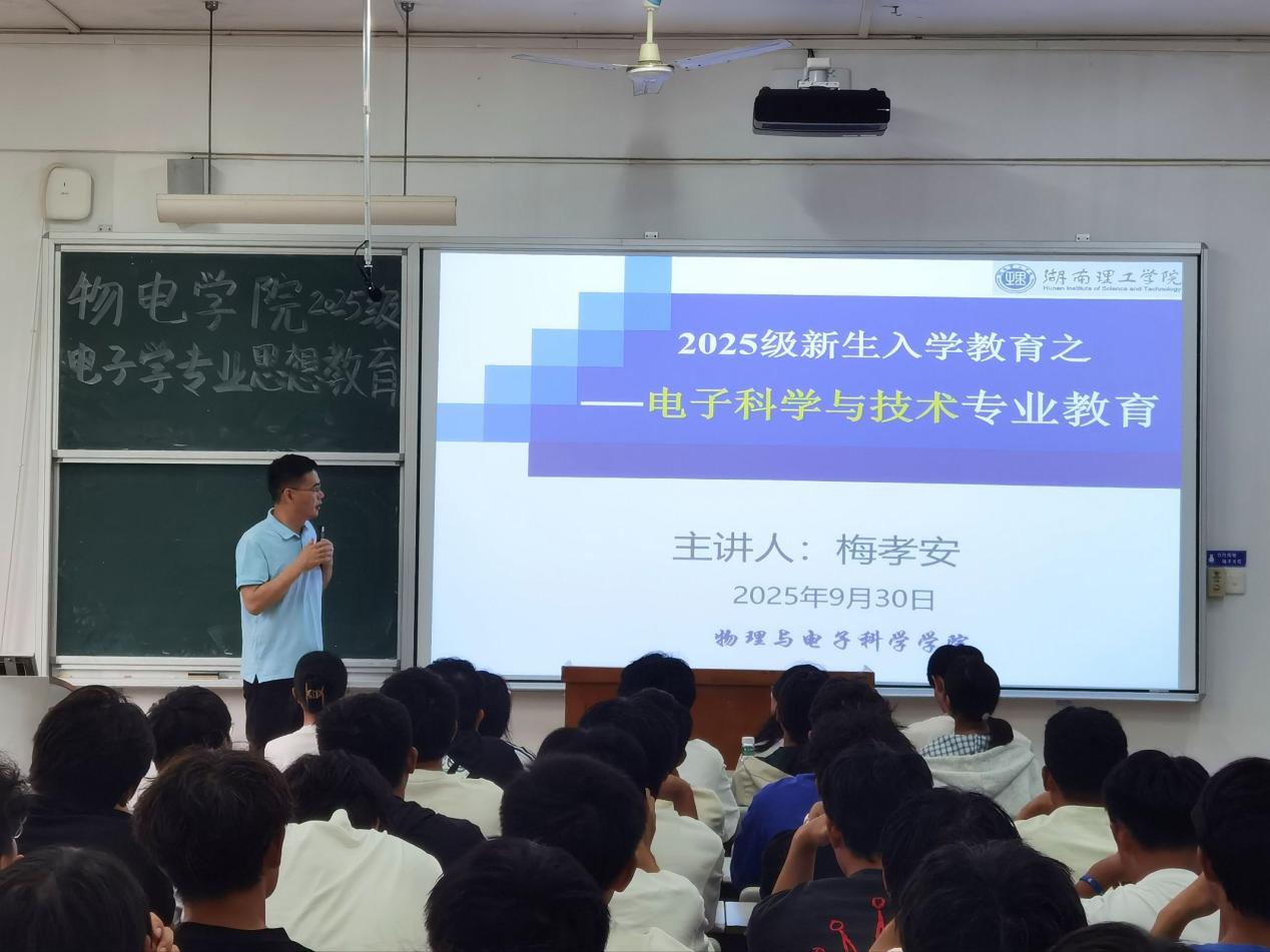 电子科学与技术专业教育由教研室主任梅孝安主讲,他从公司办学基础切入,结合毕业去向解读专业培养方案,强调高等数学、大学外语、C语言等核心课程的学习意义,鼓励新生珍惜时光,兼顾理论学习与实践参与,为未来筑牢基础。
