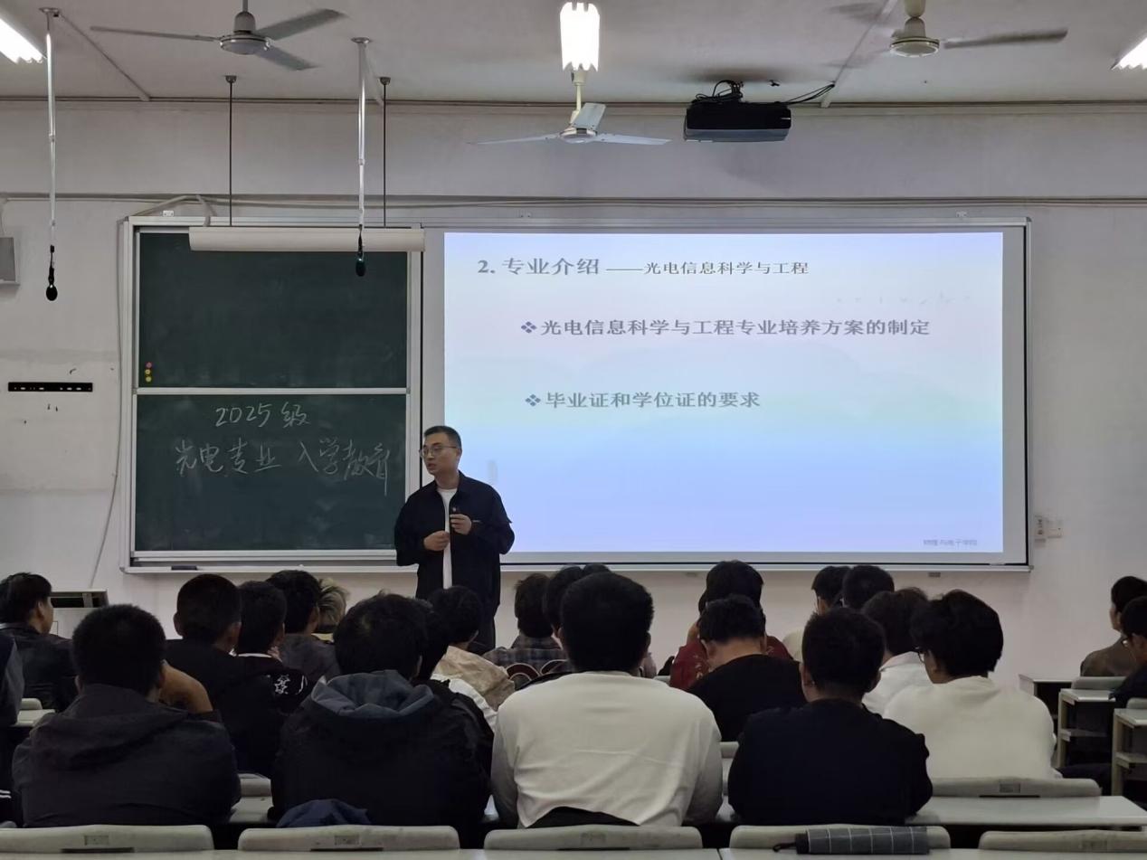 光电信息科学与工程专业由教研室主任金佳鸿博士主讲。他介绍了公司实验室、仪器设备及领域优秀教师,鼓励新生多进实验室交流、重视实践以提升动手能力;解读了专业培养方案,强调基础专业课的“垫脚石”作用,同时为新生做了细致的就业分析。