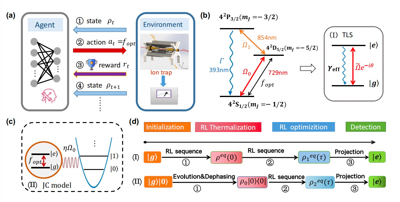 实际的量子过程会不可避免地与外部环境耦合,因而量子信息处理及其相应的热力学过程都会受到耗散和退相干等破坏性因素的影响。在该实验中,研究人员基于超冷40Ca+离子实验平台,利用机器学习中的强化学习技术,实验展示了强化学习对量子热力学过程的优化效果, 实验方法和步骤如图一所示。