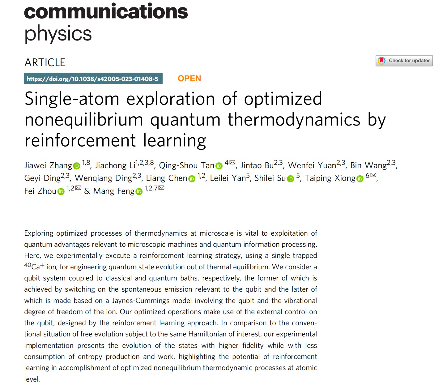 近日,永利集团3044am谭庆收教授与广州工业技术研究院量子精密测量研究中心、中国科公司精密测量科学与技术创新研究院、郑州大学等研究机构合作, 在《自然》杂志的子刊《通讯-物理》(Communications Physics)上发表题为“Single-atom exploration of optimized nonequilibrium quantum thermodynamics by reinforcement learning”的学术论文。谭庆收教授为该论文的第一通讯作者。