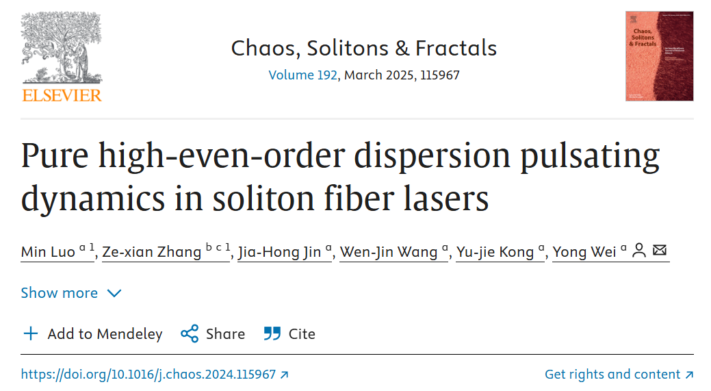 近期,罗民博士在国际非线性领域学术期刊《Chaos, Solitons & Fractals(中科院一区,IF=5.3)发表题为纯高偶数阶色散孤子光纤激光器中的脉动动力学(Pure high-even-order dispersion pulsating dynamics in soliton fiber lasers)的研究论文。罗民博士为第一作者,魏勇教授为通讯作者如图1所示