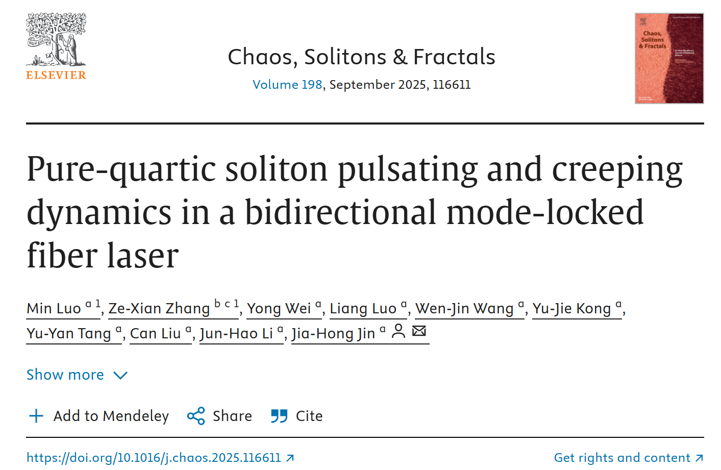 近期,公司先进光学研究团队罗民博士在国际非线性领域学术期刊《Chaos, Solitons & Fractals》(中科院一区TOP,IF=5.3)发表题为“双向锁模光纤激光器中纯四次孤子的脉动和爬行动力学”(Pure-quartic soliton pulsating and creeping dynamics in a bidirectional mode-locked fiber laser)的研究论文。通讯作者为公司金佳鸿博士,论文基本信息如图1。