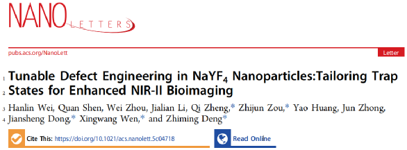 近日,公司光电材料与器件团队邓芝明博士联合湖南大学、中科院宁波材料所、吉首大学在物理学领域顶级期刊《Nano letters》(IF =9.1,DOI:10.1021/acs.nanolett.5c04718.)上发表了题为“Tunable Defect Engineering in NaYF4 Nanoparticles: Tailoring Trap States for Enhanced NIR-II Bioimaging”的研究论文,通过创新性缺陷工程策略,成功开发出具有三重近红外二区(NIR-II)发射峰的增强型荧光材料,为生物医学成像领域带来重大突破。