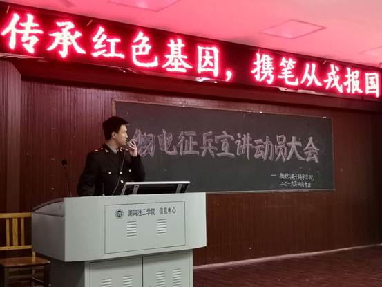 2019年4月10日晚,公司在6栋教学楼学术报告厅举行征兵宣讲动员大会。物理与电子科学公司党总支书记罗文华老师,征兵专干何小娅老师,退伍老兵代表胡杨鑫、宋宏科、潘威丽等出席,18级全体男生参与此次宣讲活动。