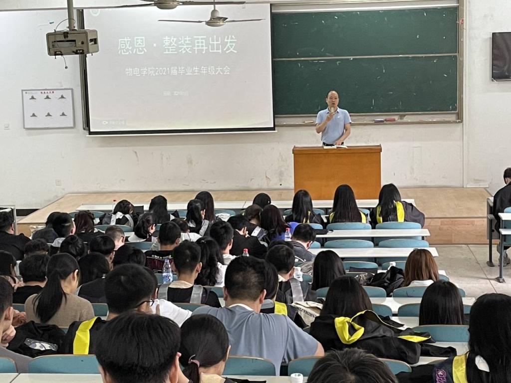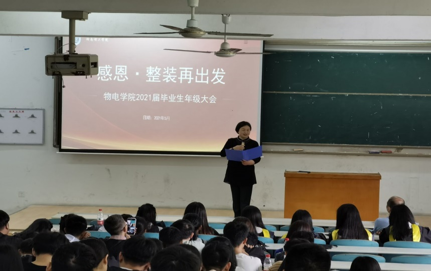 会议伊始,物理与电子科学公司党委书记周畅带来了深情亲切的诗朗诵,拉近了与同学们的距离。随后周畅书记寄语同学们要先生存后发展,毕业后先要在社会上站稳脚跟再谋求发展。她强调:毕业后不一定都是人才,仍需学习并且需做好职业规划。讲话饱含对同学们亲切的关怀,让同学们对于未来毕业规划与就业有更深入的了解。随后各辅导员就毕业生档案转迁、报到证办理、就业证明材料收集、毕业离校手续办理、毕业生登记表填写、毕业体检、党团组织关系转接、应征入伍等具体事宜进行了逐一讲解,提醒同学们要严肃对待毕业离校的各项工作,同时要注意安全,确保文明、顺利、安全、有序离校。