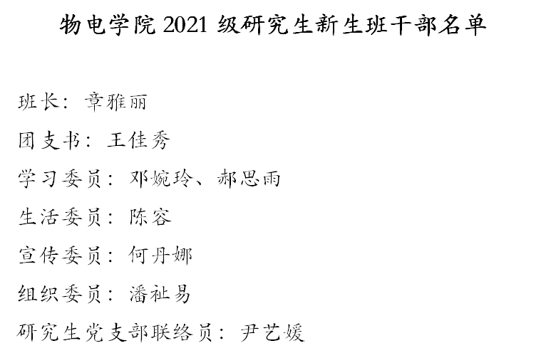 俗话说:“班干部是班级的主心骨。”会末,研究生进行了班干部选举,根据投票结果,产生了八名优秀班干部。新的班委表示会以服务为宗旨,为班集体献策献力。至此,2021级研究生新生见面会圆满结束。班干部名单附后。