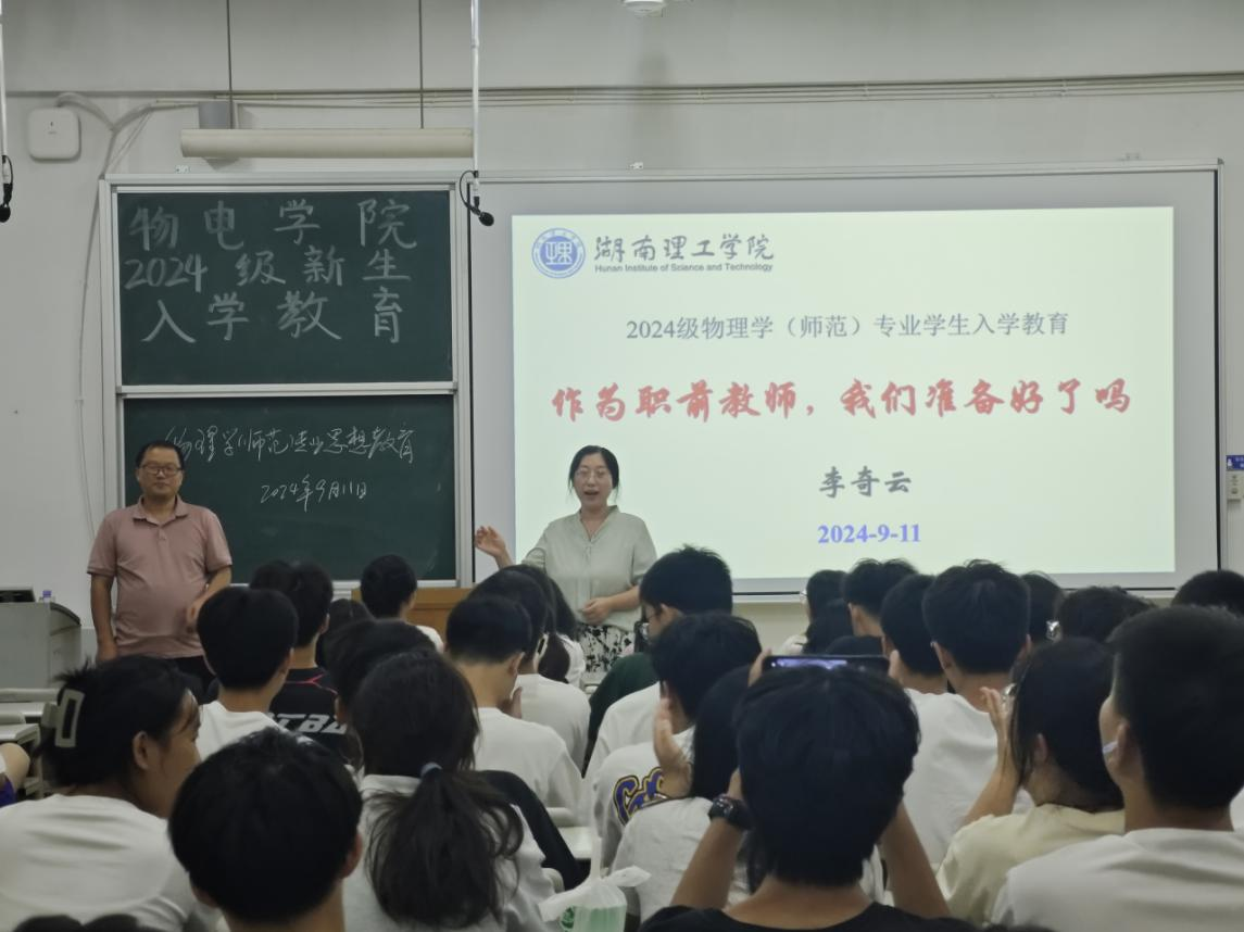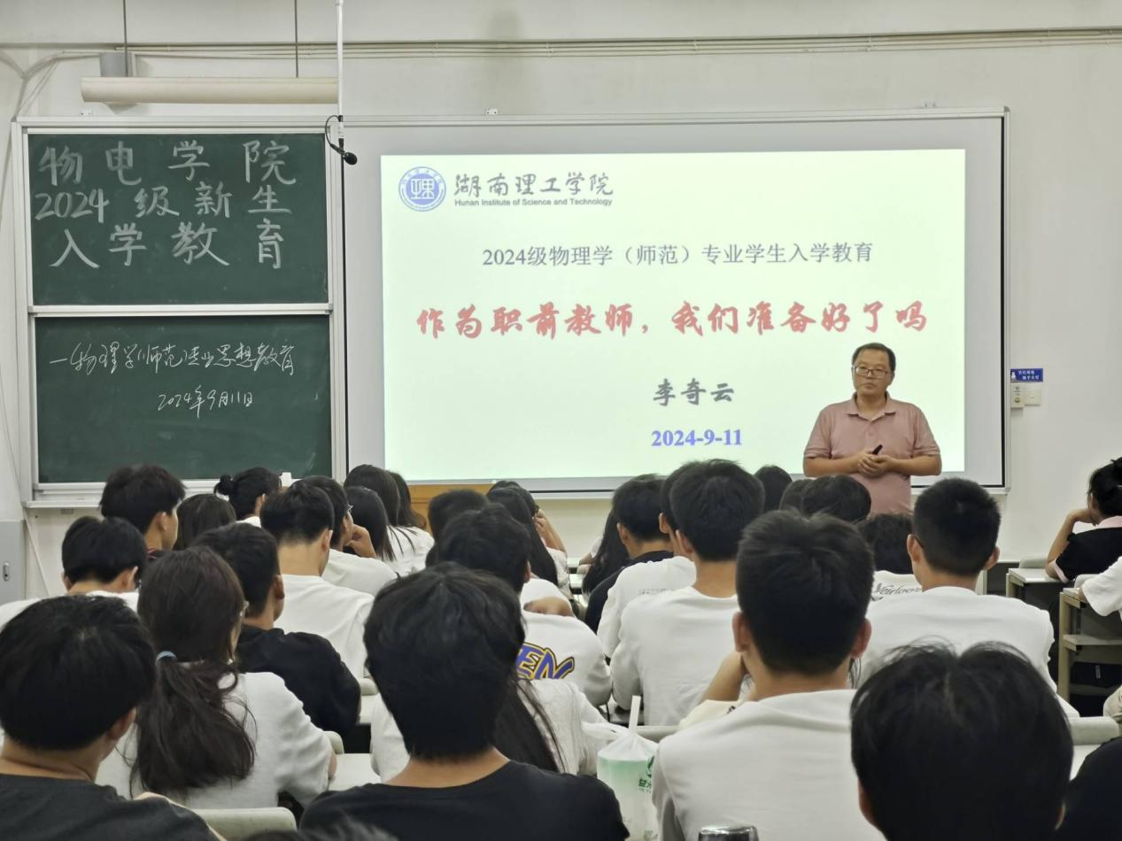 为帮助2024级新生尽快适应大学学习生活,做好生涯规划,促进大学期间全面发展与健康成长,为成为未来优秀教师打好基础,9月11日晚,公司在6102教室召开物理学(师范)专业思想教育讲座。永利集团3044am教研室主任李奇云老师主讲,物理与电子科学公司党委副书记石红芳、2024级物理学(师范)专业班主任李意芝、李磊出席,2024级物理学(师范)专业全体同学参加。