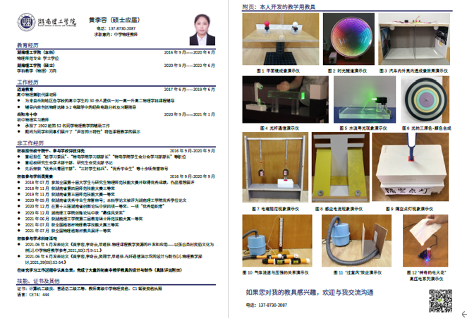 除了“光纤通信演示仪”,黄李容还研发了一系列的光学教具,例如:时空隧道演示器、平面镜成像演示仪、复色转盘、光的衍射实验教具(见黄李容简历附页)……这些成果在湖南省第十三届研究生创新论坛中均获得了一等奖,并在实际教学中也获得了一线教师与员工的认可。在获奖作品的背后,是黄李容同学一次又一次的改进与打磨,是她追求完美的精神。